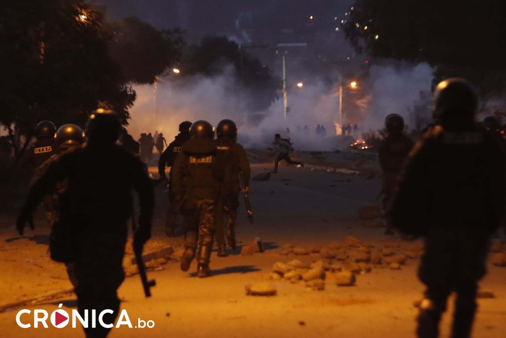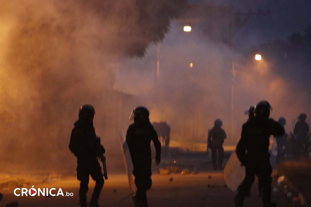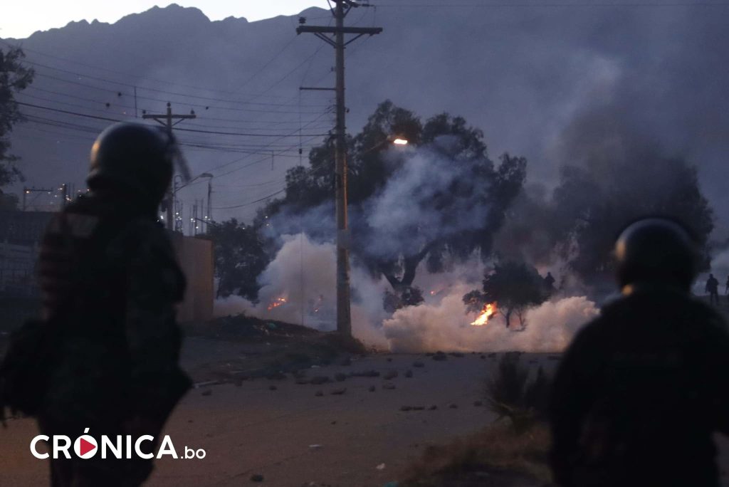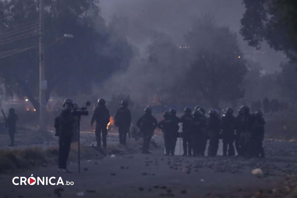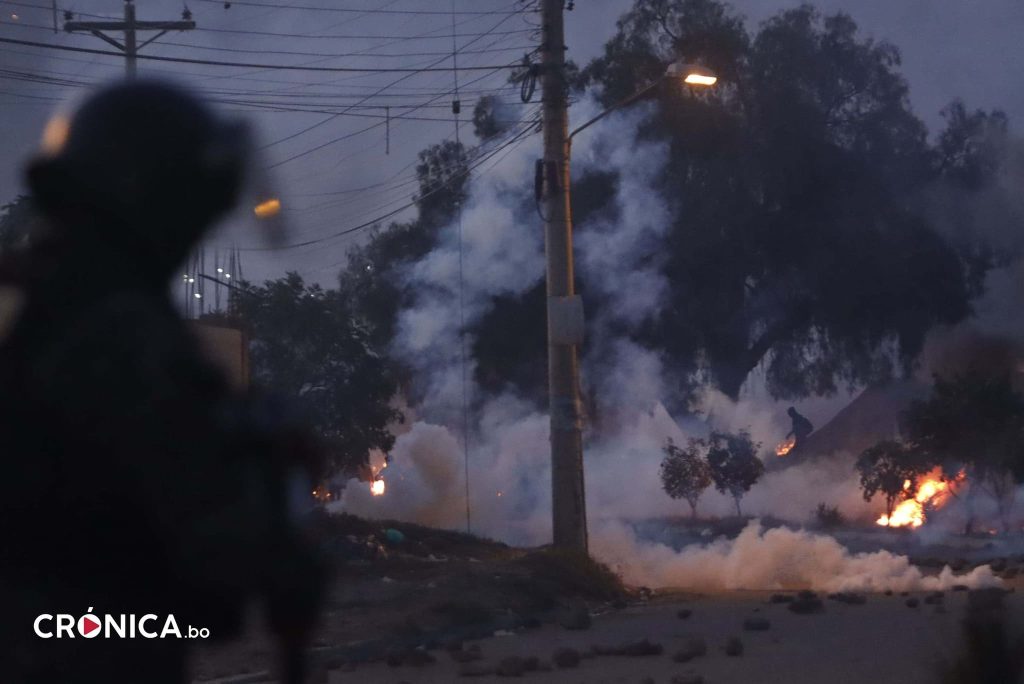 Imágenes de la intervención policial en el rio Khora II, en Vinto. Tras varios minutos de enfrentamiento con los bloqueadores ‘evistas’, lograron despejar ese tramo.